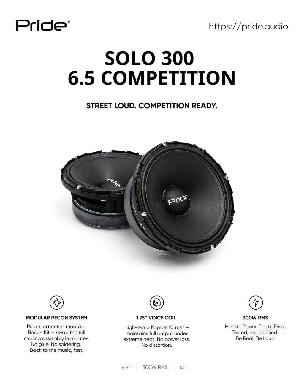 The Pride Solo 300 6.5 Competition is the ultimate 6.5″ midrange car speaker for those who demand power, reliability, and stunning vocal clarity — even in high SPL builds. Already a bestseller across Texas and the West Coast, this speaker was built for performance without compromise.