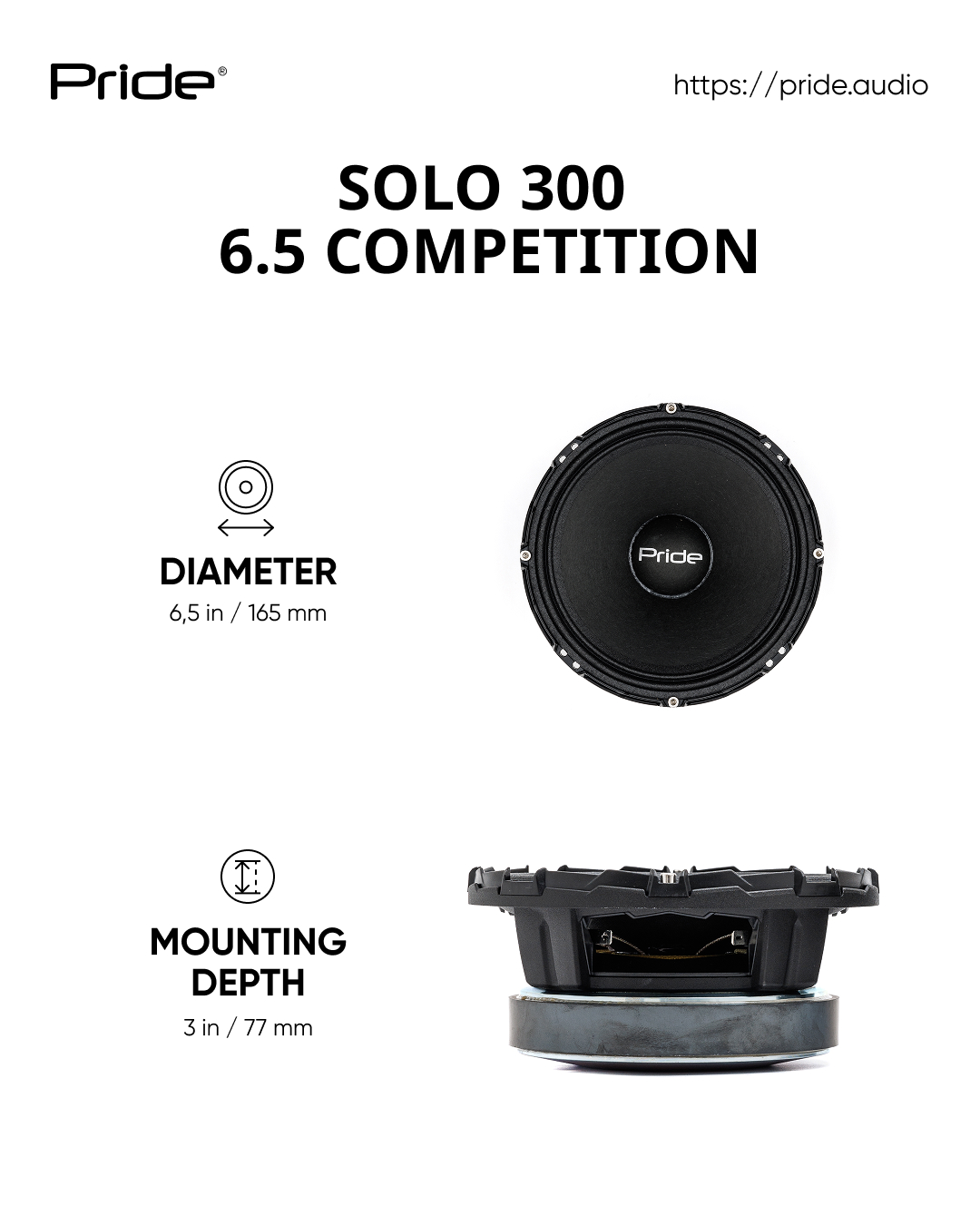 The Pride Solo 300 6.5 Competition is designed for custom car audio installations and competition builds. Due to its power handling and motor structure, proper amplification and enclosure design are required. It is not intended as a direct OEM replacement and performs best in reinforced door builds, custom pods, or dedicated midrange enclosures. Professional installation is recommended for optimal results.